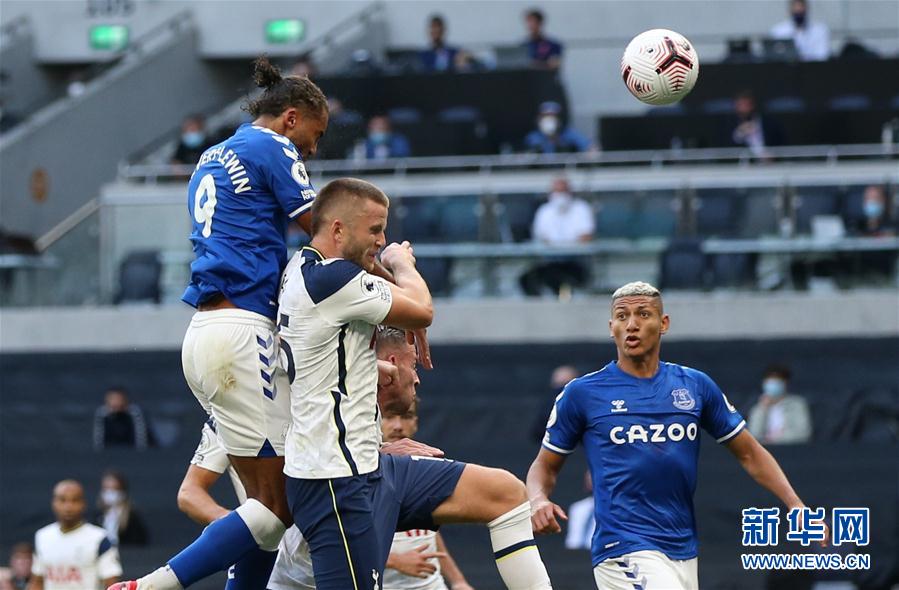 9月13日,埃弗顿队球员卡尔弗特·卢因(上)头球攻门得分。 当日,在2020-2021赛季英格兰足球超级联赛首轮比赛中,埃弗顿队客场以1比0战胜托特纳姆热刺队。 新华社/路透