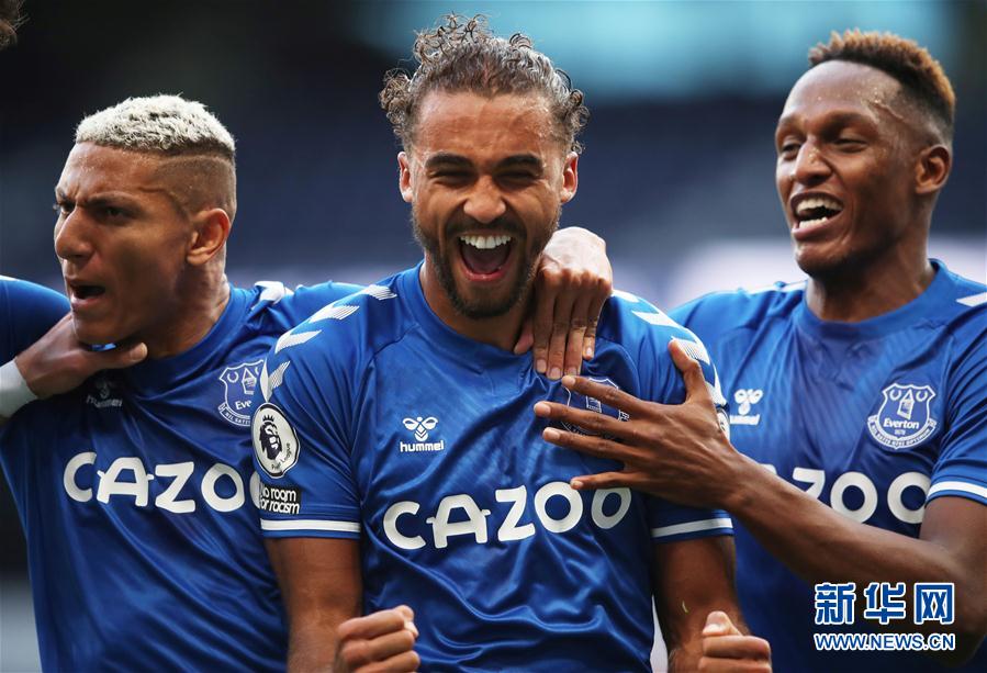 9月13日,埃弗顿队球员卡尔弗特·卢因(中)进球后与队友庆祝。 当日,在2020-2021赛季英格兰足球超级联赛首轮比赛中,埃弗顿队客场以1比0战胜托特纳姆热刺队。 新华社/路透