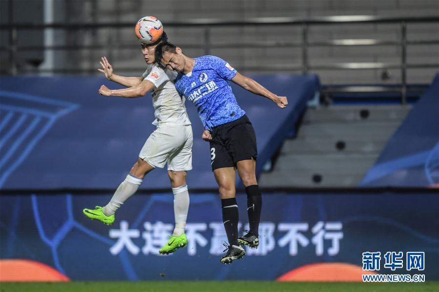 9月14日,上海绿地申花队球员于汉超(左)在比赛中与大连人队球员王耀鹏争顶头球。 当日,在2020赛季中国足球协会超级联赛第一阶段(大连赛区)第11轮比赛中,大连人队以1比1战平上海绿地申花队。 新华社记者 潘昱龙 摄
