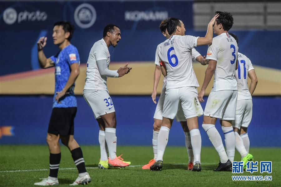 9月14日,上海绿地申花队球员毕津浩(右二)进球后与队友庆祝。 当日,在2020赛季中国足球协会超级联赛第一阶段(大连赛区)第11轮比赛中,大连人队以1比1战平上海绿地申花队。 新华社记者 潘昱龙 摄
