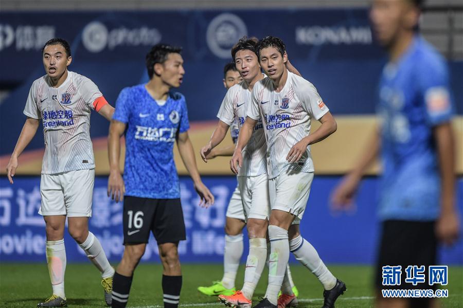 9月14日,上海绿地申花队球员毕津浩(右二)进球后与队友庆祝。 当日,在2020赛季中国足球协会超级联赛第一阶段(大连赛区)第11轮比赛中,大连人队以1比1战平上海绿地申花队。 新华社记者 潘昱龙 摄