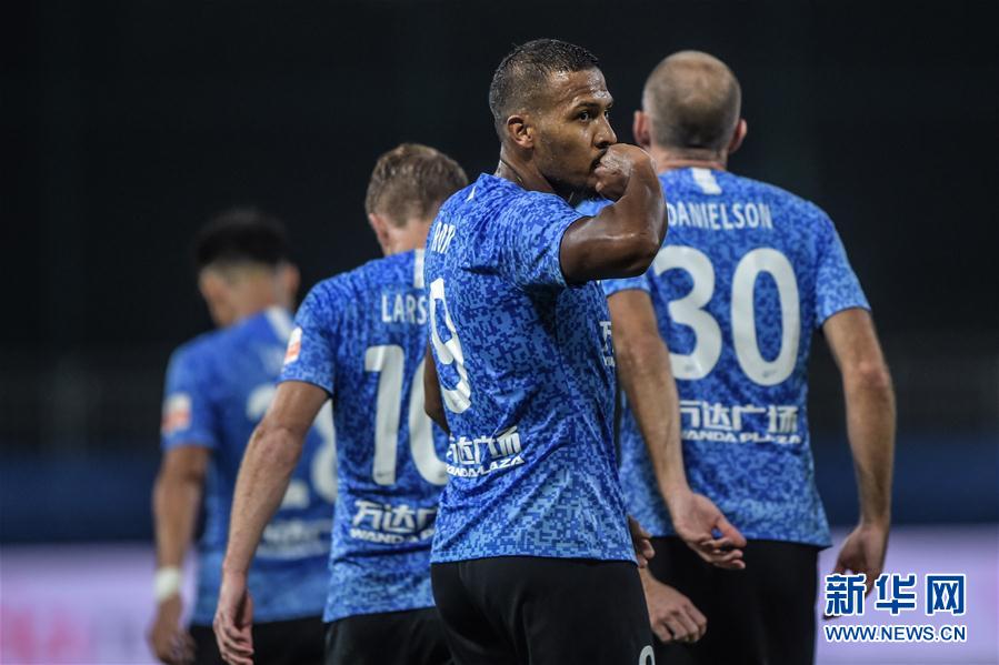 9月14日,大连人队球员龙东(前)进球后庆祝。 当日,在2020赛季中国足球协会超级联赛第一阶段(大连赛区)第11轮比赛中,大连人队以1比1战平上海绿地申花队。 新华社记者 潘昱龙 摄