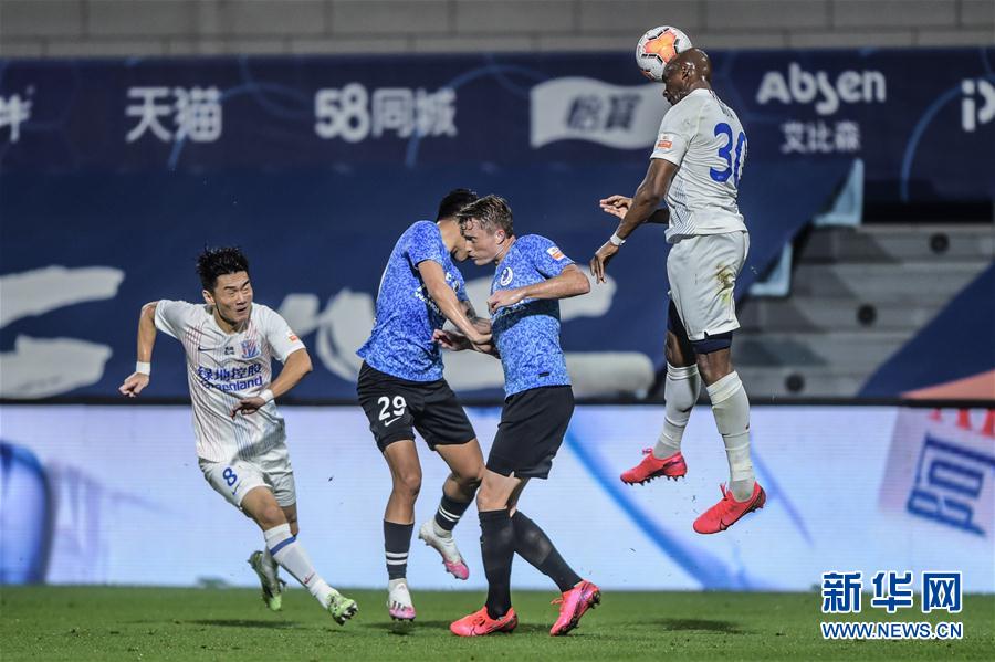 9月14日,上海绿地申花队球员姆比亚(右)在比赛中争顶头球。 当日,在2020赛季中国足球协会超级联赛第一阶段(大连赛区)第11轮比赛中,大连人队以1比1战平上海绿地申花队。 新华社记者 潘昱龙 摄