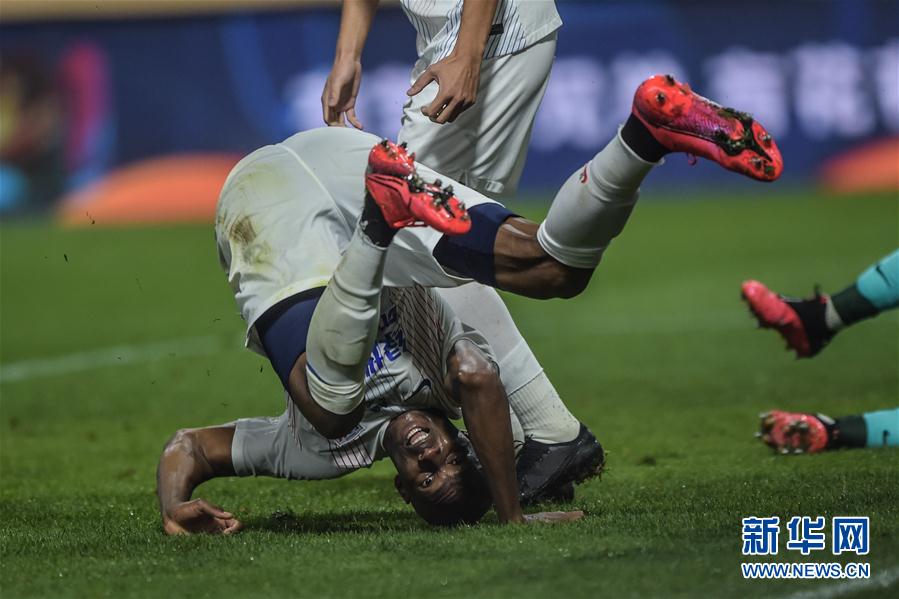 9月14日,上海绿地申花队球员姆比亚在比赛中头球攻门后倒地。 当日,在2020赛季中国足球协会超级联赛第一阶段(大连赛区)第11轮比赛中,大连人队以1比1战平上海绿地申花队。 新华社记者 潘昱龙 摄