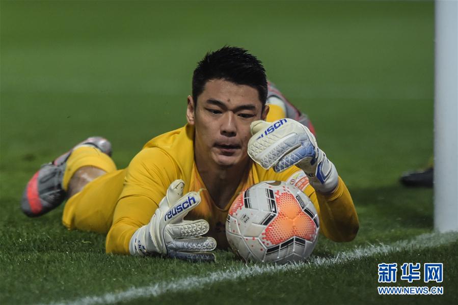 9月14日,上海绿地申花队守门员曾诚在比赛中扑救。 当日,在2020赛季中国足球协会超级联赛第一阶段(大连赛区)第11轮比赛中,大连人队以1比1战平上海绿地申花队。 新华社记者 潘昱龙 摄