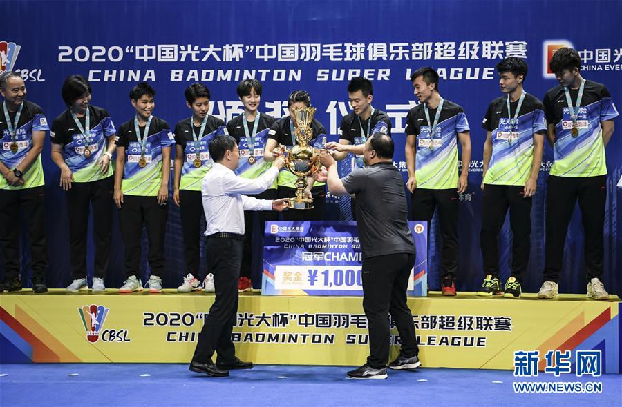 9月14日,中国羽毛球协会主席张军(前右)和中国光大集团副总经理付万军(前左)为青岛仁洲队颁发冠军奖杯。 当日,在四川成都举行的2020中国羽毛球俱乐部超级联赛第二阶段淘汰赛决赛中,青岛仁洲队以3比0战胜瑞昌碧源队,夺得冠军。 新华社记者 王曦 摄