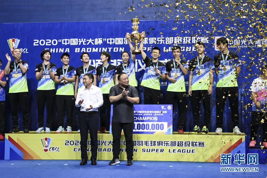 9月14日,青岛仁洲队成员和嘉宾在颁奖仪式上。 当日,在四川成都举行的2020中国羽毛球俱乐部超级联赛第二阶段淘汰赛决赛中,青岛仁洲队以3比0战胜瑞昌碧源队,夺得冠军。 新华社记者 王曦 摄