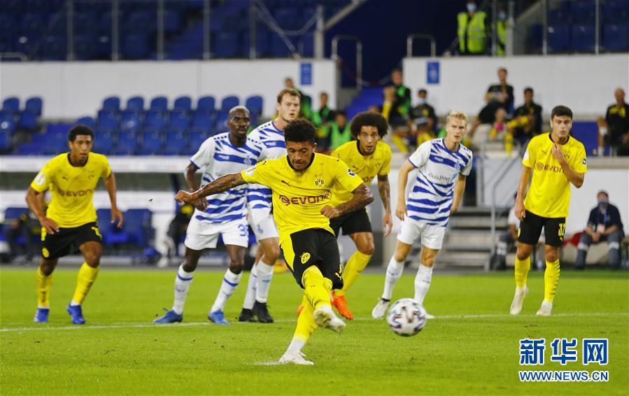 9月14日,多特蒙德队球员桑乔(前)攻入点球。 当日,在2020-2021赛季德国杯足球赛第一轮比赛中,多特蒙德队客场以5比0战胜杜伊斯堡队。 新华社/美联
