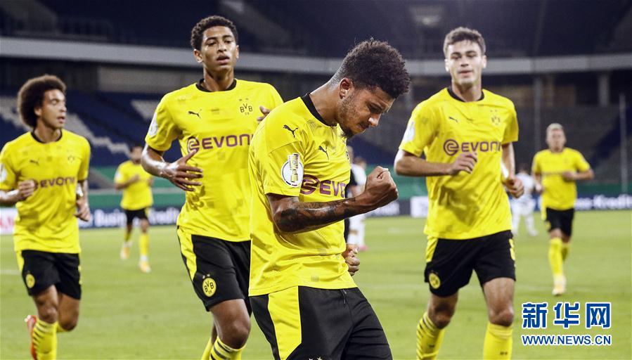 9月14日,多特蒙德队球员桑乔(前)庆祝进球。 当日,在2020-2021赛季德国杯足球赛第一轮比赛中,多特蒙德队客场以5比0战胜杜伊斯堡队。 新华社/美联