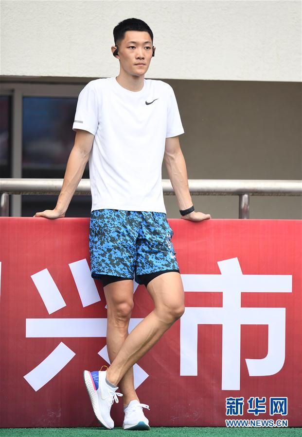 9月14日,男子跳远运动员、江苏铁人队选手王嘉男进行场地适应训练。 当日,参赛运动员在浙江省绍兴市上虞体育场进行场地适应训练,备战将于9月15日至18日在这里举行的2020年全国田径锦标赛。 新华社记者贾宇辰摄