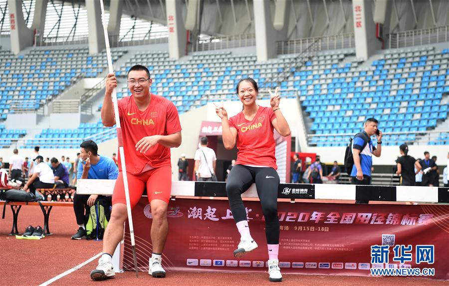 9月14日,山东队标枪运动员刘诗颖(前右)和姜武君(前左)在场地适应训练间隙合影。 当日,参赛运动员在浙江省绍兴市上虞体育场进行场地适应训练,备战将于9月15日至18日在这里举行的2020年全国田径锦标赛。 新华社记者贾宇辰摄