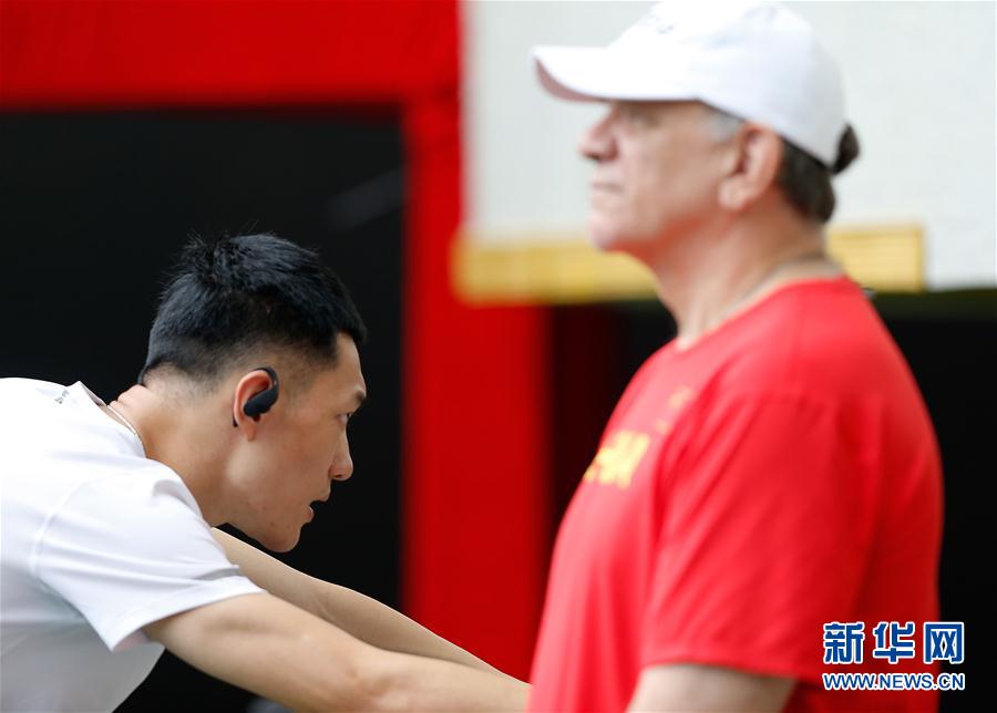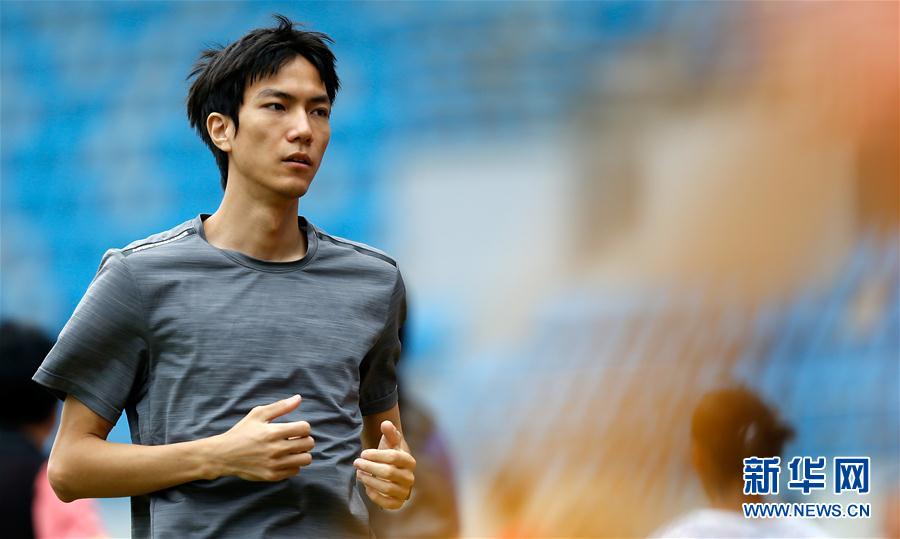 9月14日,男子跳远运动员、江苏铁人队选手王嘉男(左)进行场地适应训练。 当日,参赛运动员在浙江省绍兴市上虞体育场进行场地适应训练,备战将于9月15日至18日在这里举行的2020年全国田径锦标赛。 新华社记者王丽莉摄