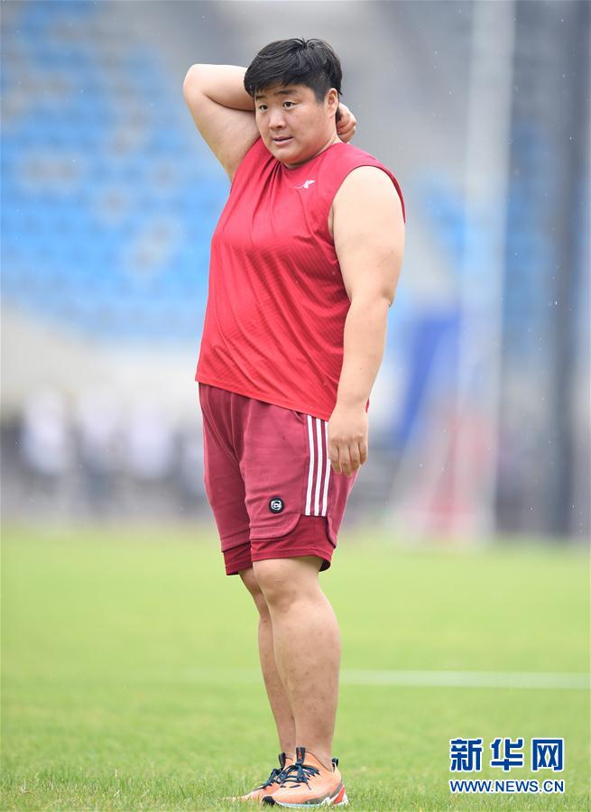 9月14日,持观摩证的女子铅球世界冠军巩立姣在体育场观看运动员训练。 当日,参赛运动员在浙江省绍兴市上虞体育场进行场地适应训练,备战将于9月15日至18日在这里举行的2020年全国田径锦标赛。 新华社记者贾宇辰摄