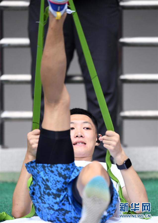 9月14日,男子跳远运动员、江苏铁人队选手王嘉男进行场地适应训练。 当日,参赛运动员在浙江省绍兴市上虞体育场进行场地适应训练,备战将于9月15日至18日在这里举行的2020年全国田径锦标赛。 新华社记者贾宇辰摄