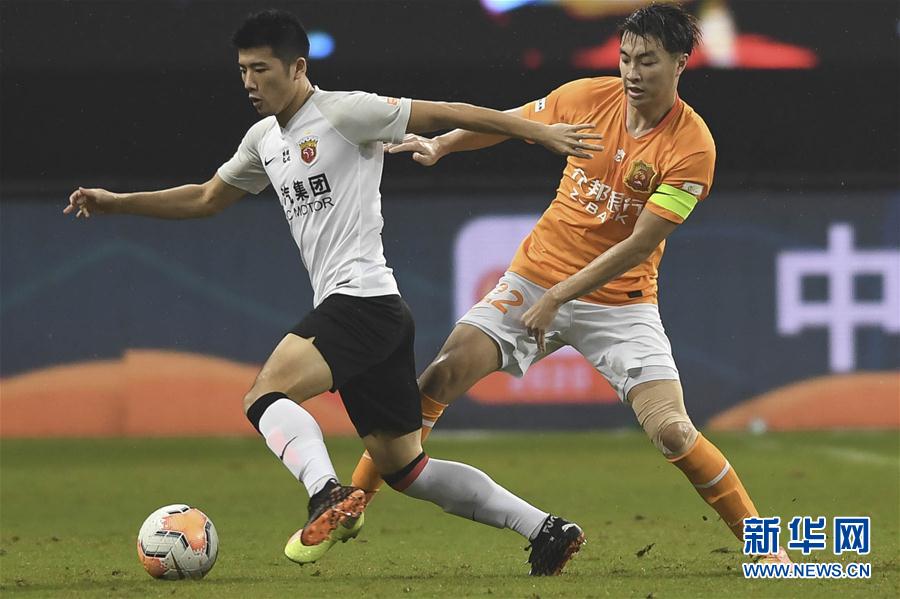 9月15日,武汉卓尔队球员廖均健(右)在比赛中防守上海上港队球员李圣龙。 当日,在2020赛季中国足球协会超级联赛第一阶段(苏州赛区)第11轮比赛中,上海上港队以2比1战胜武汉卓尔队。 新华社记者 季春鹏 摄