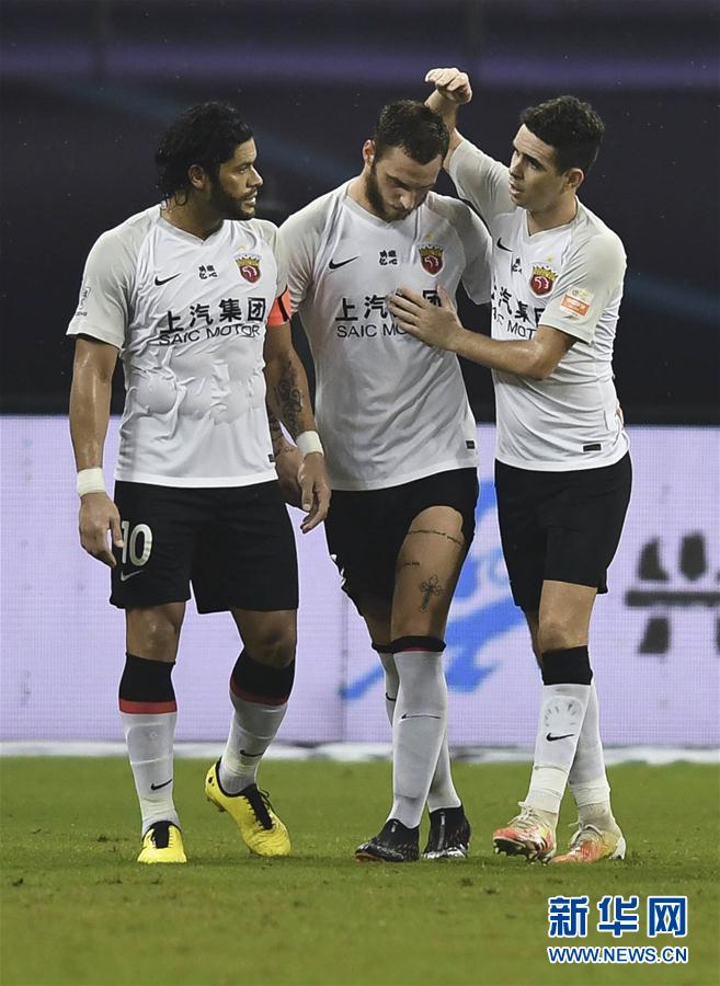 9月15日,上海上港队球员阿瑙托维奇(中)进球后与队友胡尔克(左)、奥斯卡庆祝。 当日,在2020赛季中国足球协会超级联赛第一阶段(苏州赛区)第11轮比赛中,上海上港队以2比1战胜武汉卓尔队。 新华社记者 季春鹏 摄