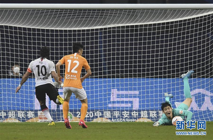 9月15日,武汉卓尔队守门员王智峰(右)在比赛中扑救。 当日,在2020赛季中国足球协会超级联赛第一阶段(苏州赛区)第11轮比赛中,上海上港队以2比1战胜武汉卓尔队。 新华社记者 季春鹏 摄
