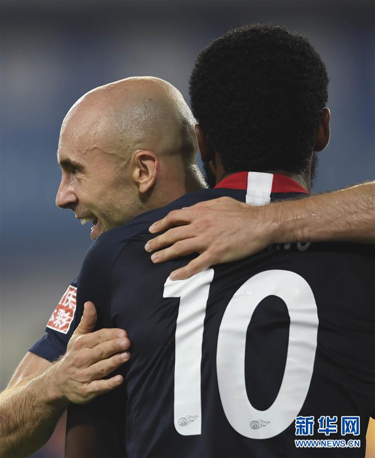 9月16日,重庆当代队球员阿德里安(左)在赛中与队友西里诺庆祝进球。 当日,在2020赛季中国足球协会超级联赛第一阶段(苏州赛区)第11轮比赛中,重庆当代队以3比0战胜青岛黄海青港队。 新华社记者 季春鹏 摄