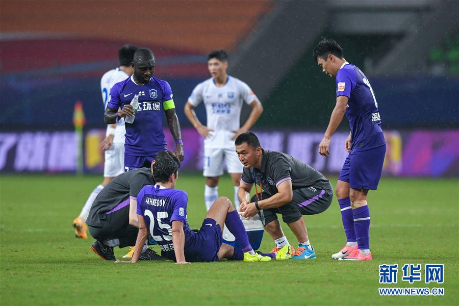 9月16日,天津泰达队球员艾哈迈多夫(前左二)在比赛中受伤接受治疗。 当日,在2020赛季中国足球协会超级联赛第一阶段(苏州赛区)第11轮比赛中,天津泰达队以1比1战平石家庄永昌队。 新华社记者 李博 摄