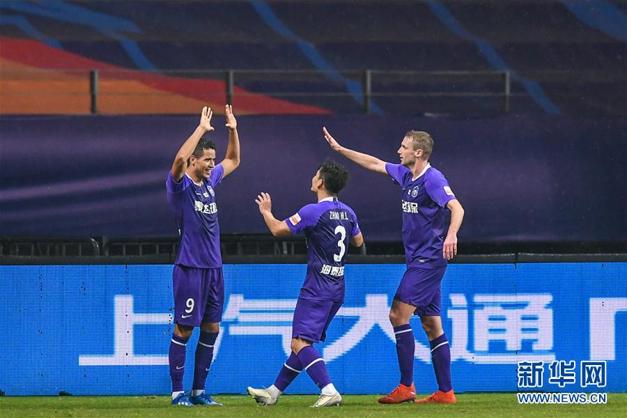 9月16日,天津泰达队球员桑德罗利马(左一)进球后与队友庆祝。 当日,在2020赛季中国足球协会超级联赛第一阶段(苏州赛区)第11轮比赛中,天津泰达队以1比1战平石家庄永昌队。 新华社记者 李博 摄