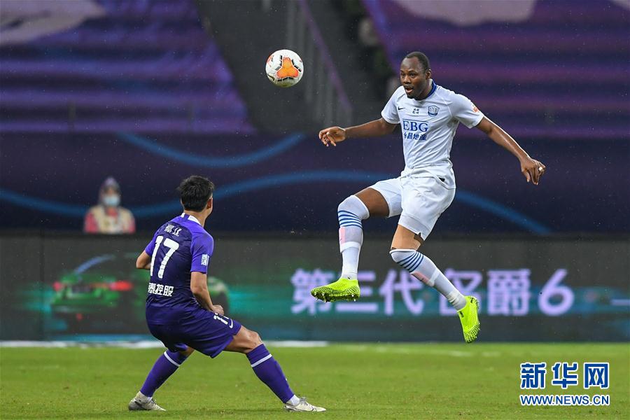 9月16日,天津泰达队球员惠家康与石家庄永昌队球员苏祖(右)在比赛中拼抢。 当日,在2020赛季中国足球协会超级联赛第一阶段(苏州赛区)第11轮比赛中,天津泰达队以1比1战平石家庄永昌队。 新华社记者 李博 摄