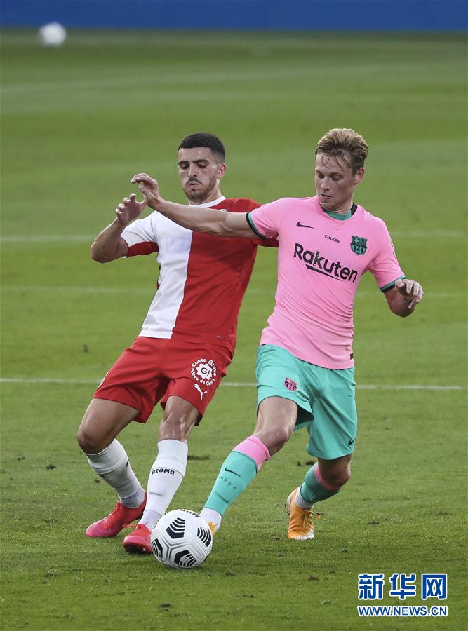 9月16日,巴塞罗那队球员德容(右)与赫罗纳队球员卡拉维拉在比赛中拼抢。 当日,在西班牙巴塞罗那进行的一场热身赛中,西甲巴塞罗那队以3比1战胜西乙赫罗纳队。 新华社发(胡安·戈萨摄)
