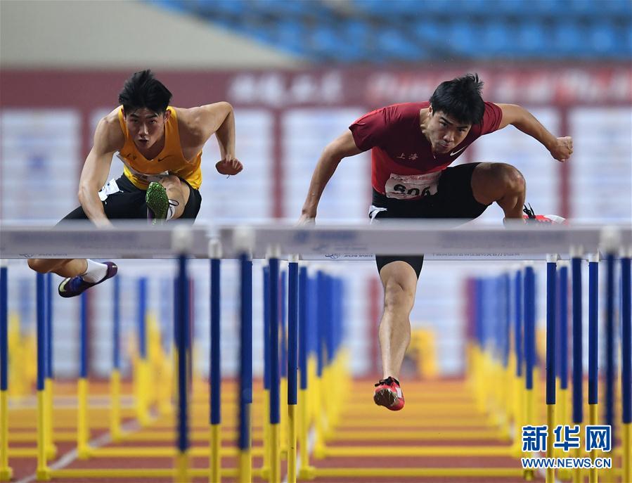 9月16日,上海队选手谢文骏(右)和福建队选手曾建航在男子110米栏决赛中。最终上海队选手谢文骏以13秒24的成绩夺冠,福建队选手曾建航以13秒54的成绩获得亚军。 当日,在浙江省绍兴市举行的2020年全国田径锦标赛进入第二个比赛日。 新华社记者 贾宇辰 摄