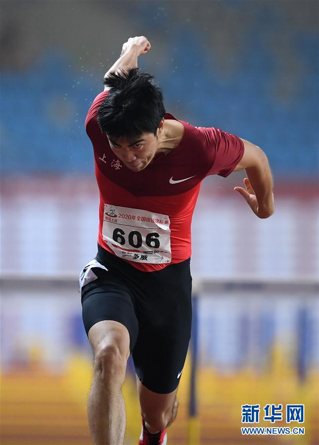 9月16日,上海队选手谢文骏在男子110米栏决赛中。最终他以13秒24的成绩夺冠。 当日,在浙江省绍兴市举行的2020年全国田径锦标赛进入第二个比赛日。 新华社记者 贾宇辰 摄