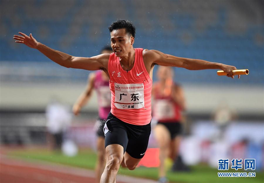 9月16日,广东队第四棒选手莫有雪在男子4X100米决赛中冲过终点。最终,由黄永炼、陈冠锋、张瑞轩和莫有雪组成的广东队以39秒00的成绩夺冠。 当日,在浙江省绍兴市举行的2020年全国田径锦标赛进入第二个比赛日。 新华社记者 贾宇辰 摄