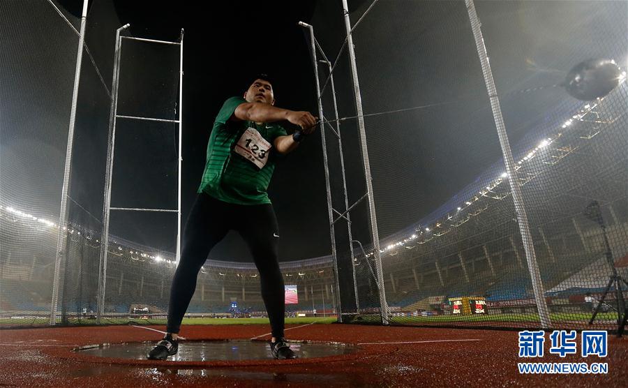 9月16日,江苏铁人队选手姜河在男子链球决赛中。最终,姜河以67米64的成绩获得季军。 当日,在浙江省绍兴市举行的2020年全国田径锦标赛进入第二个比赛日。 新华社记者 王丽莉 摄