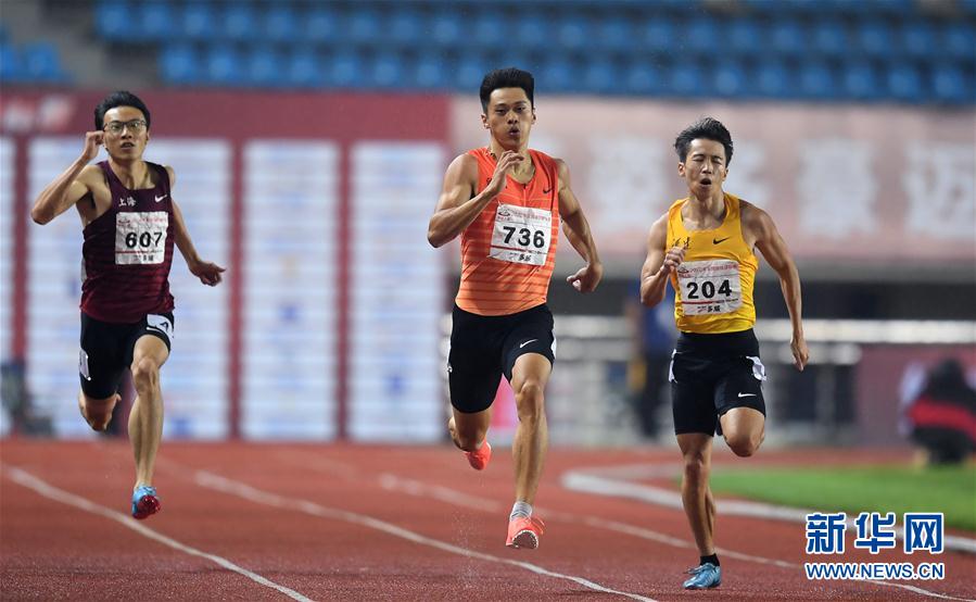 9月17日,浙江队选手谢震业(中)和福建队选手汤星强(右)在男子200米决赛中,最终谢震业以20秒72的成绩夺冠,汤星强以20秒94的成绩获得季军。 当日,在浙江省绍兴市举行的2020年全国田径锦标赛进入第三个比赛日。 新华社记者贾宇辰摄