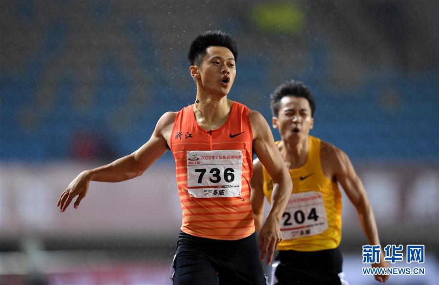 9月17日,浙江队选手谢震业(左)在男子200米决赛后,最终他以20秒72的成绩夺冠。 当日,在浙江省绍兴市举行的2020年全国田径锦标赛进入第三个比赛日。 新华社记者贾宇辰摄
