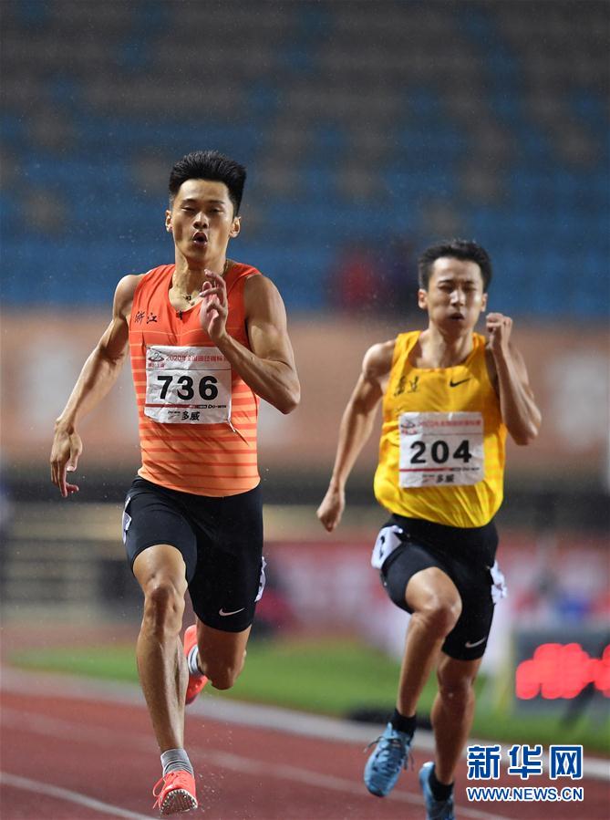9月17日,浙江队选手谢震业(左)和福建队选手汤星强在男子200米决赛中,最终谢震业以20秒72的成绩夺冠,汤星强以20秒94的成绩获得季军。 当日,在浙江省绍兴市举行的2020年全国田径锦标赛进入第三个比赛日。 新华社记者贾宇辰摄