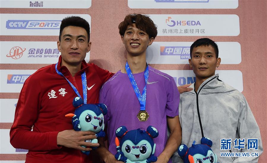 9月17日,冠军广东队选手吴瑞庭(中)、亚军辽宁队选手朱亚明(左)和季军陕西队选手方耀庆在男子三级跳远颁奖仪式后合影。最终,吴瑞庭以16米90的成绩夺冠,朱亚明以16米79的成绩获得亚军,方耀庆以16米64的成绩获得季军。 当日,在浙江省绍兴市举行的2020年全国田径锦标赛进入第三个比赛日。 新华社记者 贾宇辰 摄