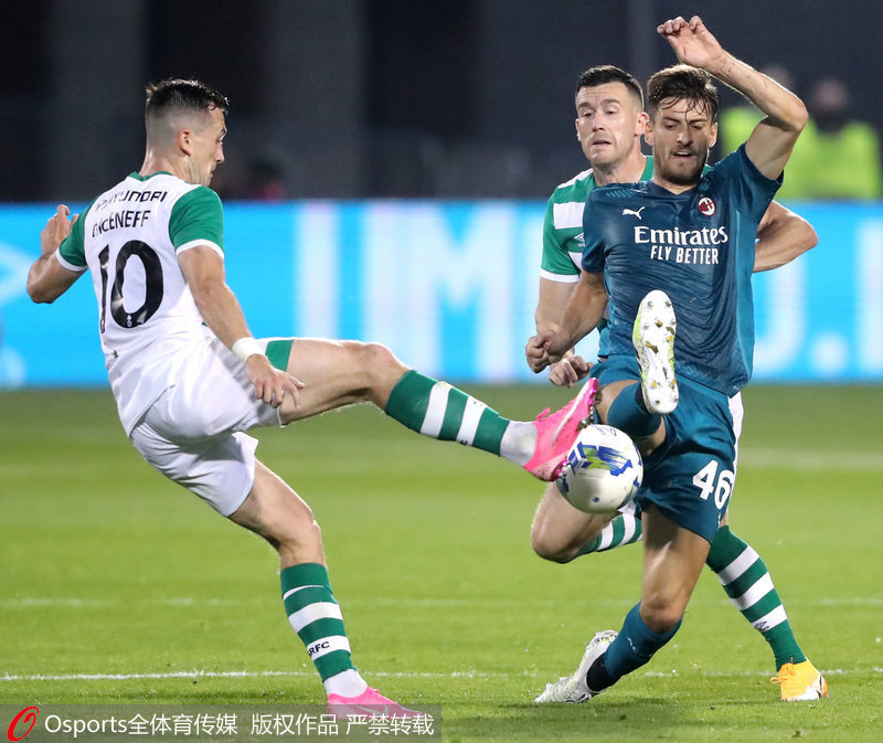 第67分钟,AC米兰扩大比分。凯西禁区内把球顺给卡斯蒂略霍,后者禁区中路遭到位置堵截,把球做给了跟进的恰尔汗奥卢,后者大禁区线上大力轰门,皮球贴着右侧立柱进网,2-0。最终,米兰客场2-0击败沙姆罗克流浪晋级。
