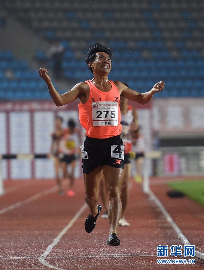 9月18日,贵州队选手骆淳在男子3000米障碍决赛中,最终他以8分59秒53的成绩夺冠。 当日,在浙江省绍兴市举行的2020年全国田径锦标赛进入最后一个比赛日。 新华社记者贾宇辰摄