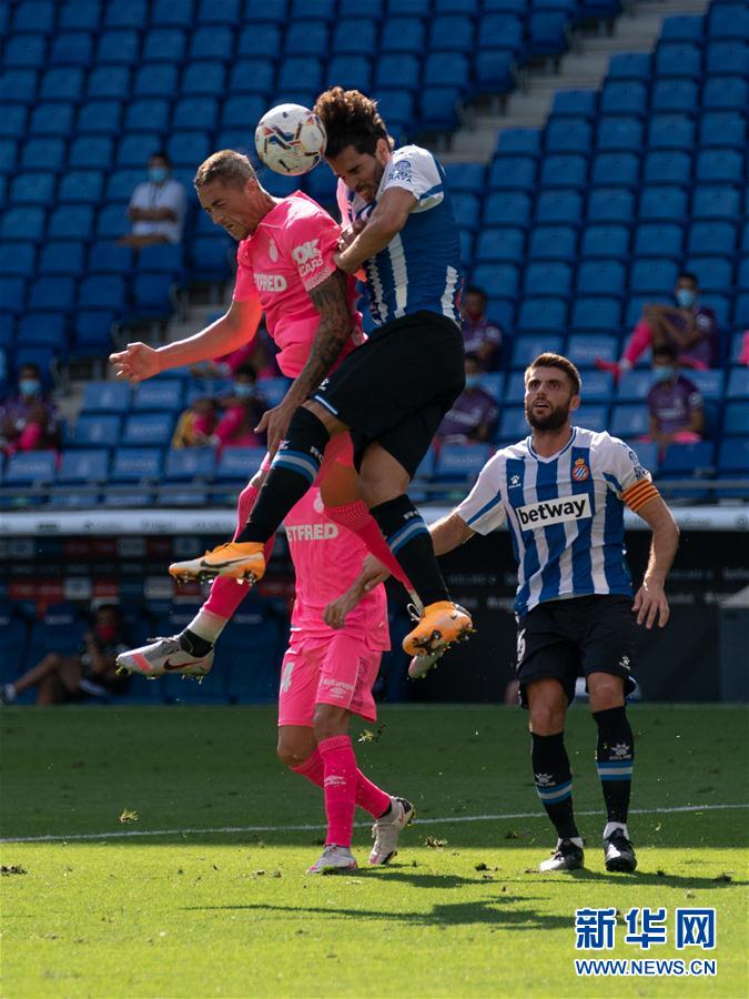 9月20日,西班牙人队球员卡夫雷拉(上右)与马略卡队球员塞维利亚(上左)在比赛中争顶。 当日,在2020-2021赛季西班牙足球乙级联赛第二轮比赛中,西班牙人队主场以0比0战平马略卡队。 新华社发(胡安·戈萨摄)