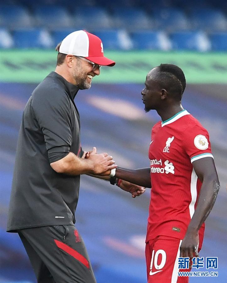 9月20日,利物浦队球员马内(右)与主教练克洛普庆祝得分。 当日,2020-2021赛季英格兰足球超级联赛第二轮比赛中,利物浦队客场以2比0战胜切尔西队。 新华社/路透