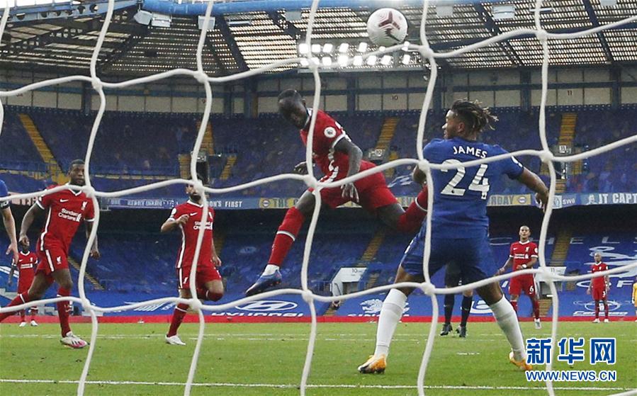 9月20日,利物浦队球员马内(中)在比赛中破门得分。 当日,2020-2021赛季英格兰足球超级联赛第二轮比赛中,利物浦队客场以2比0战胜切尔西队。 新华社/路透