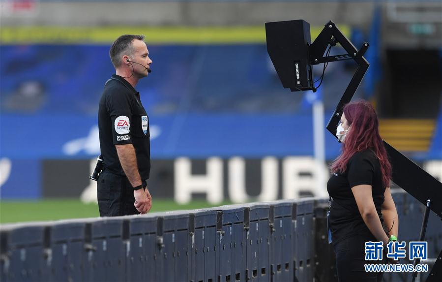 9月20日,本场主裁判蒂尔尼(左)在场边查看比赛VAR。 当日,2020-2021赛季英格兰足球超级联赛第二轮比赛中,利物浦队客场以2比0战胜切尔西队。 新华社/路透