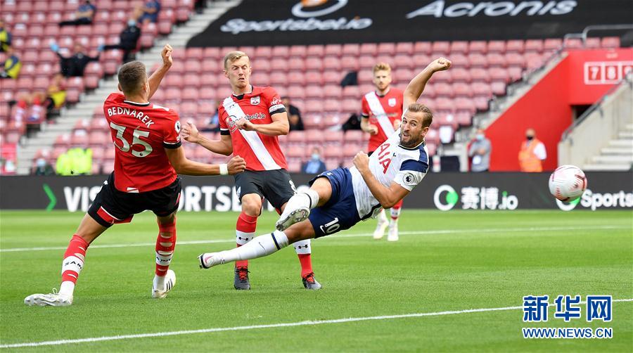 9月20日,托特纳姆热刺队球员凯恩(前右)在比赛中射门。 当日,在2020-2021赛季英格兰足球超级联赛第二轮比赛中,托特纳姆热刺队客场以5比2战胜南安普敦队。 新华社/路透
