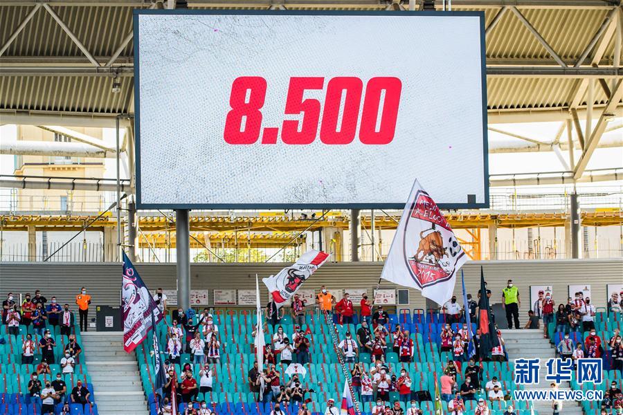 9月20日,球场内的屏幕显示本场共有8500名球迷入场观赛。 当日,在2020-2021赛季德国足球甲级联赛首轮比赛中,莱比锡队主场以3比1战胜美因茨队。 新华社发(凯文·福格特摄)