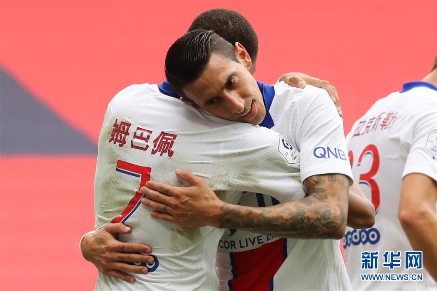 9月20日,巴黎圣日耳曼队球员迪玛利亚(右)进球后与队友姆巴佩庆祝。 当日,在2020-2021赛季法国足球甲级联赛第四轮比赛中,巴黎圣日耳曼队客场以3比0战胜尼斯队。 新华社/法新