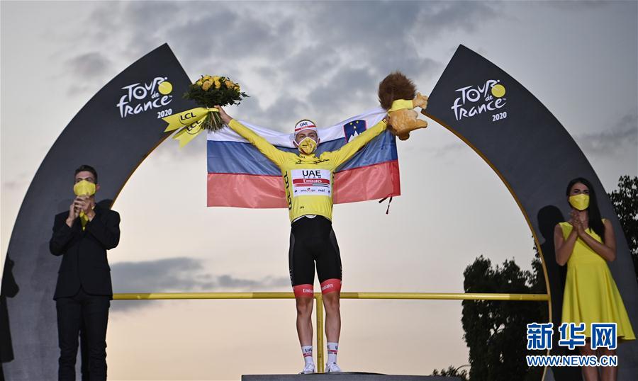 9月20日,阿联酋航空车队斯洛文尼亚车手波加查尔在领奖台上留影。 当日,2020环法自行车赛在巴黎香榭丽舍大街落下帷幕。阿联酋航空车队的波加查尔以87小时20分05秒的总成绩,成为环法历史上首位加冕总冠军的斯洛文尼亚车手。 新华社/法新