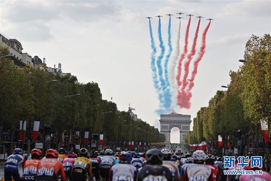 9月20日,参赛选手在香榭丽舍大街骑行时,“法兰西巡逻兵”飞行表演队飞过凯旋门。 当日,2020环法自行车赛在巴黎香榭丽舍大街落下帷幕。阿联酋航空车队的波加查尔以87小时20分05秒的总成绩,成为环法历史上首位加冕总冠军的斯洛文尼亚车手。 新华社/法新