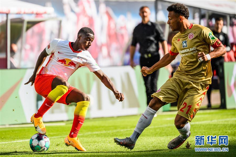 9月20日,莱比锡队球员海德拉(左)在美因茨队球员奥尼西沃的防守下带球突破。 当日,在2020-2021赛季德国足球甲级联赛首轮比赛中,莱比锡队主场以3比1战胜美因茨队。 新华社发(凯文·福格特摄)