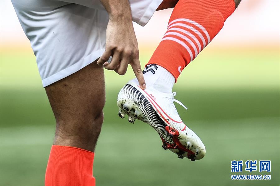 9月21日,广州恒大淘宝队球员艾克森进球后指着球鞋上自己孩子的名字。 当日,在2020赛季中国足球协会超级联赛第一阶段(大连赛区)第12轮比赛中,广州恒大淘宝队对阵河南建业队。 新华社记者潘昱龙摄