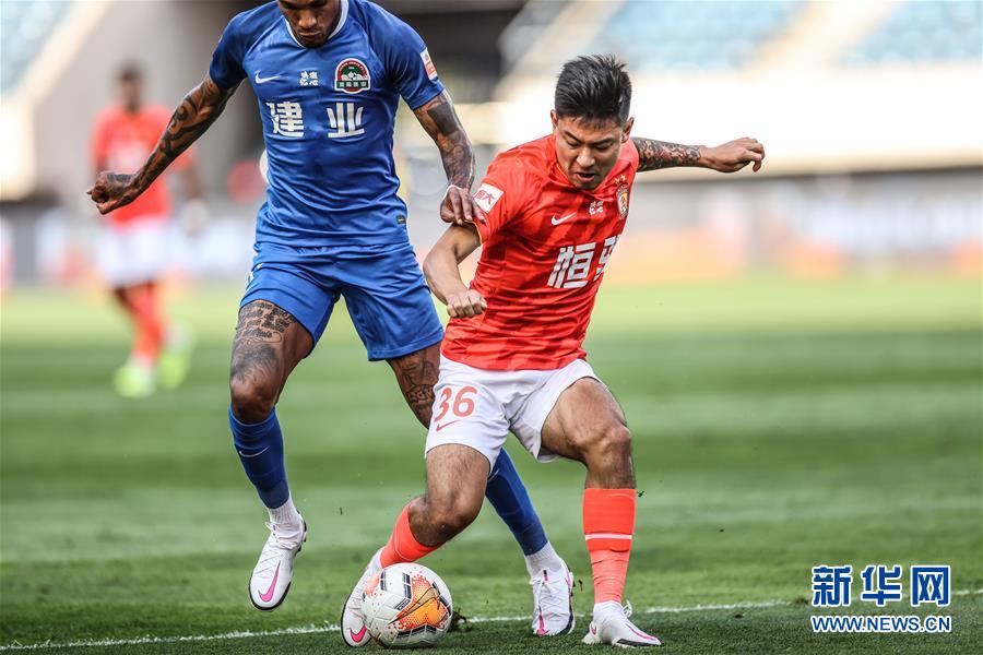 9月21日,广州恒大淘宝队球员何超(右)在禁区内被河南建业队球员卡兰加绊倒,广州恒大淘宝队获得一粒点球。 当日,在2020赛季中国足球协会超级联赛第一阶段(大连赛区)第12轮比赛中,广州恒大淘宝队对阵河南建业队。 新华社记者潘昱龙摄