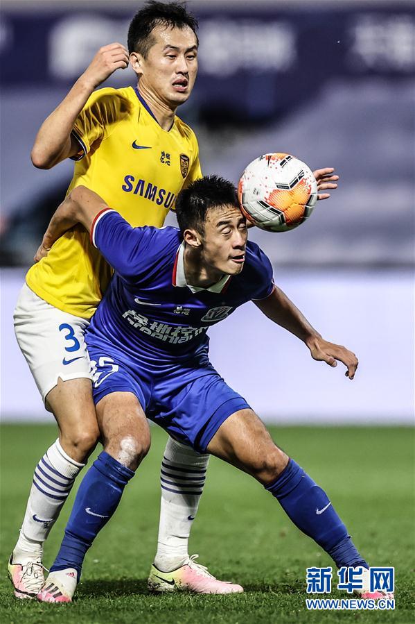 9月21日,江苏苏宁易购队球员田依浓(左)与上海绿地申花队球员彭欣力在比赛中拼抢。 当日,在2020赛季中国足球协会超级联赛第一阶段(大连赛区)第12轮比赛中,江苏苏宁易购队以0比0战平上海绿地申花队。 新华社记者潘昱龙摄