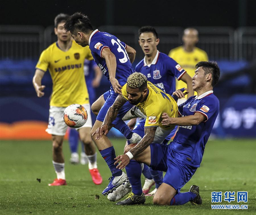 9月21日,江苏苏宁易购队球员特谢拉(前中)在比赛中突破受阻。 当日,在2020赛季中国足球协会超级联赛第一阶段(大连赛区)第12轮比赛中,江苏苏宁易购队以0比0战平上海绿地申花队。 新华社记者潘昱龙摄
